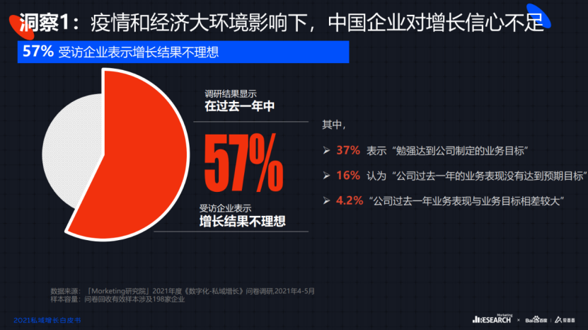 调研结果显示,在过去一年中,57%受访企业表示,增长结果不理想。对于2021年公司业务增长目标,仅有31%受访企业对未来增长目标持乐观态度。