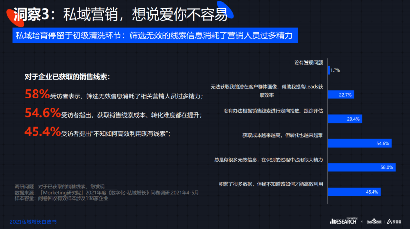 当下,流量红利见顶,公域线索获取难度、成本提高。54.6%受访者认为,获取销售线索成本、转化难度都在提升;过半受访者提出“不知如何评估、优化投放效果”。这样来看,私域对企业增长的重要性不言而喻。