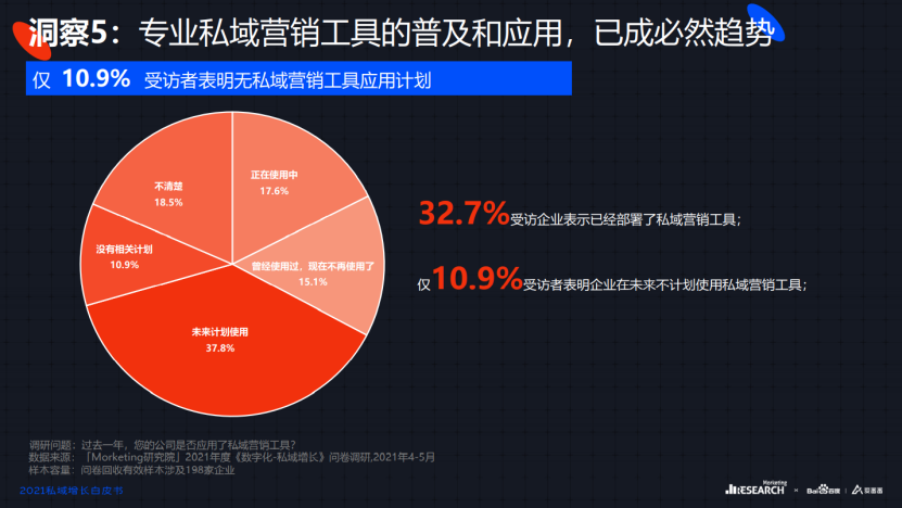 此外,相较过去,当前企业普遍对私域运营工具呈开放、拥抱的态度:受访企业中,32.7%表示企业已经部署了私域营销工具,而37.8%则将在未来计划部署私域营销工具。