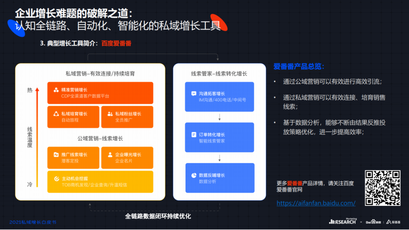 比如百度爱番番,这款工具可以通过公域营销进行高效引流,通过私域营销有效连接、培育销售线索。基于数据分析,爱番番还能够不断由结果反推投放策略优化,进一步提高效率。