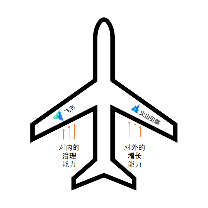 看这张图。字节跳动的战略,是想通过飞书,和火山引擎这两个翅膀,把自己对内治理,和对外增长上溢出的能力,分享给2B的企业。