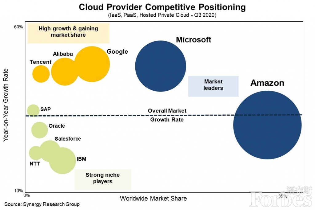 云计算的市场份额,目前亚马逊全球第一。几乎占到一半。