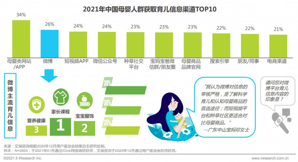 艾瑞咨询研究发现,在2021年中国母婴人群获取育儿信息渠道TOP10中,微博是仅次于母婴类网站的公域信息平台。一方面,母婴人群会在微博主动搜索信息,另一方面,母婴圈比较倾向信赖专家以及对知识类内容有着非常强的刚需。