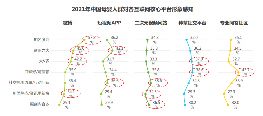 报告显示,微博上丰富的儿科医生/科普账号,专业性强,在母婴人群中获得了较高的认可。短视频的育儿达人较多,种草社区的品牌官方账号多,问答社区则通过内容丰富、专业、原创内容多等特点积攒了良好口碑。