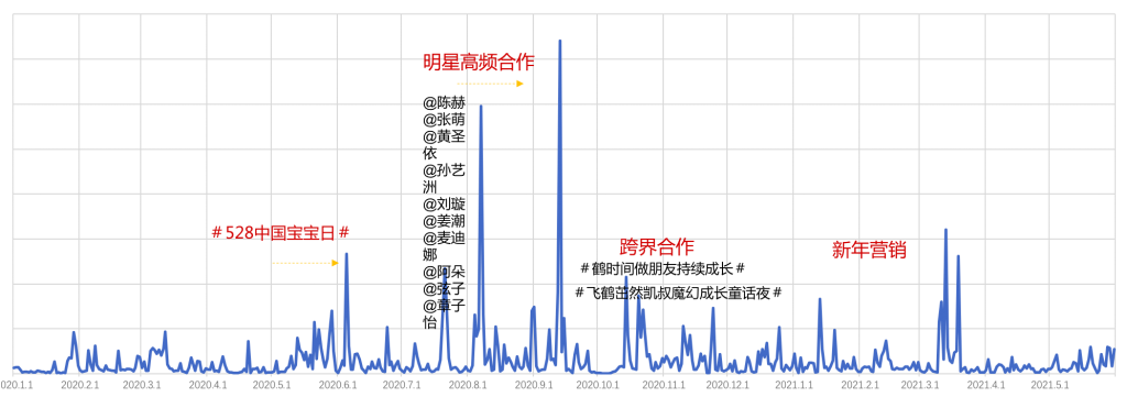 数据显示,飞鹤2020.1.1-2021.5.1微博声量走势与以上这套社交媒体向的组合打法呈强相关。