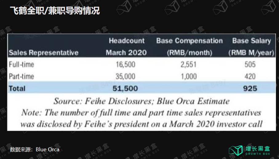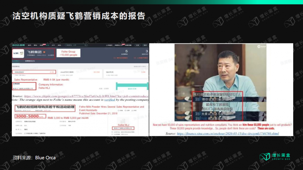 Blue Orca先是用2019年飞鹤经销商与其员工之间的雇佣诉讼,佐证了飞鹤支付了导购员的基本工资,然后又找到了飞鹤招聘专职导购员的多条招聘信息,计算出导购员平均月薪为2551元,再然后从2020年3月的投资者电话会议上得到证据,飞鹤拥有超过5万名销售人员。