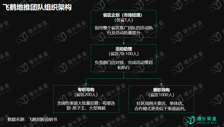 早在2013年,飞鹤就布局起了地推活动,那时一年还仅有几万场。到了2016年,飞鹤正式发展出地推团队,以省为单位进行管理,最初一个省有3-4人,2017年增加到20余人,2020年扩展至70-100人,并按层级分为省区企划、活动助理、专职或兼职导购。因此,全国飞鹤自有的专业地推团队大约有4000人,专职的活动助理签订劳动合同,工资由飞鹤承担,五险一金挂靠经销商。