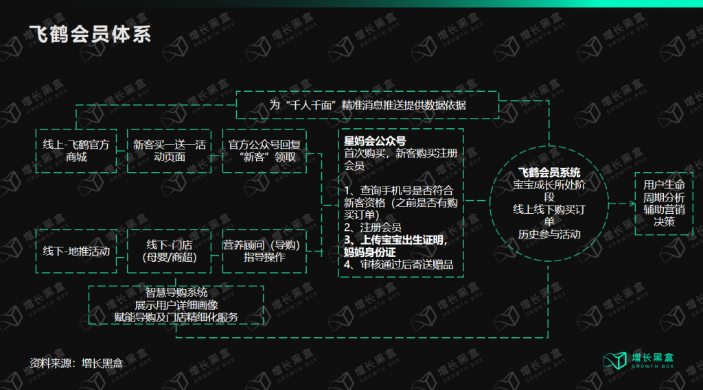 一旦消费者在注册系统时输入宝宝的出生信息和手机号码后,一个新用户画像就完成了大半,所手机的信息也顺理成章地进入了飞鹤搭建的数据中台。