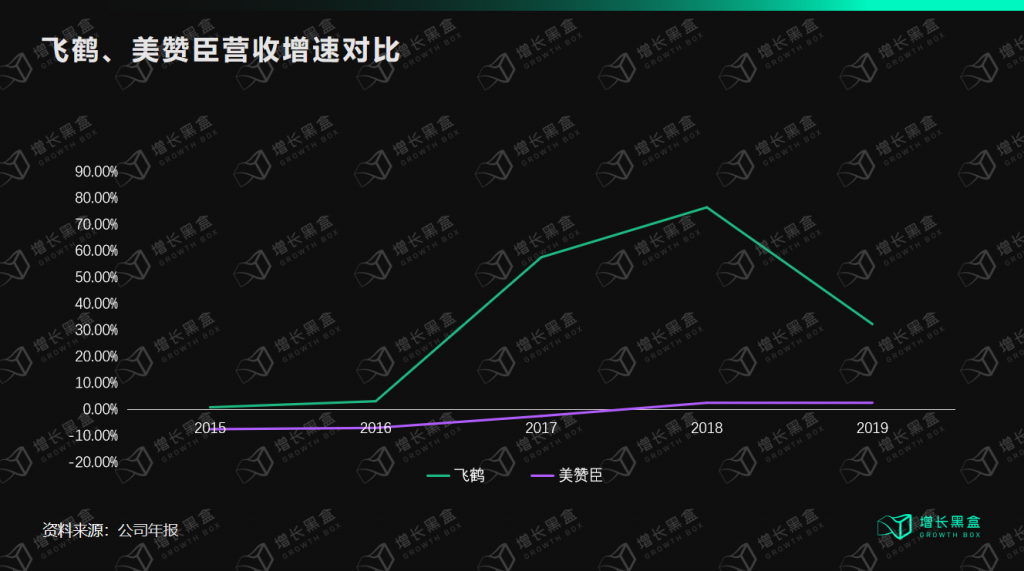 2015-2019年,当美赞臣的营收增速几乎停滞不前的时候,飞鹤大踏步跃进,2018年时增速一度高达近80%。