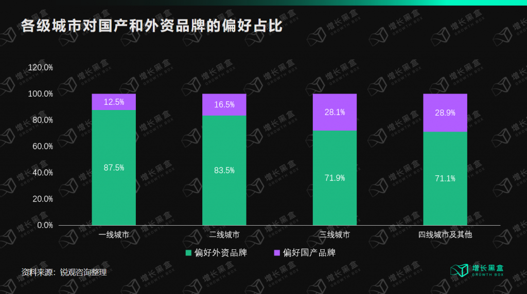 再加之,近年来三四线城市的母婴消费能力迅速提升,父母对于高品质婴幼儿奶粉的有了负担条件。据锐观咨询的数据显示,三四线城市的消费者对于国产奶粉的偏好比一二线城市高出10%-20%。