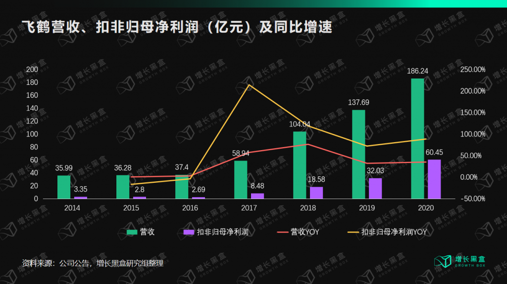 综上所述,飞鹤在选定高端产品+低线市场的战略,且保证了高度一致性之后,五年多来营收、净利润均稳定高速增长,毛利率、净利率也稳步提升。营收从2016年的37.24亿元增至2020年的186.24亿元,5年CARG达到49.38%;净利润从2016年的2.69亿元增至2020年的60.45亿元,5年CARG为117.72%。