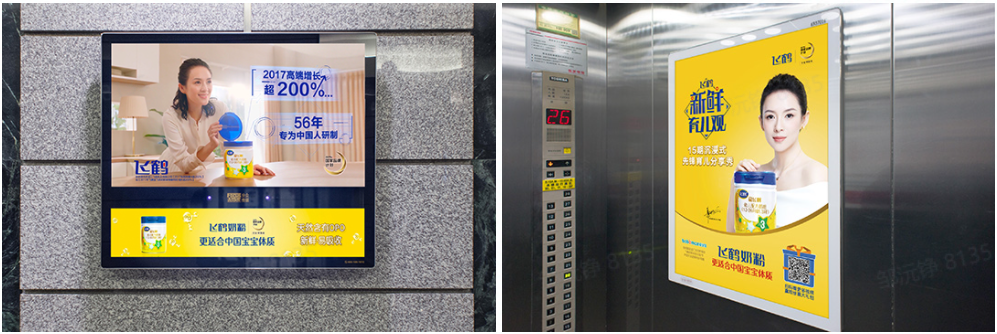 2017年,飞鹤与分众传媒达成战略合作。几个月的时间,迅速60多个城市进行广告投放,以分众传媒高频且强制到达的电梯广告的优势,形成了强大的“空中轰炸团”,日均触达 5 亿人次主流人群。