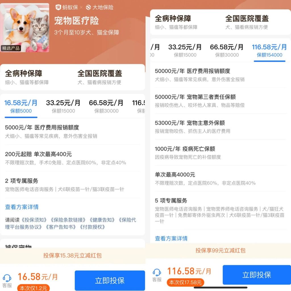 蚂蚁保和大地保险推出的宠物医疗保险最低档位与最高档位的服务 / 截图自支付宝