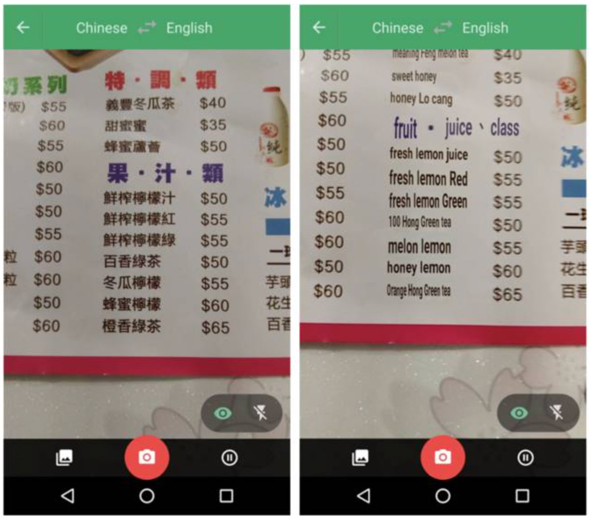 比如下面两张图片,你只用将相机对准菜单,选中的图片就可以通过Google翻译APP自动翻译成英文。