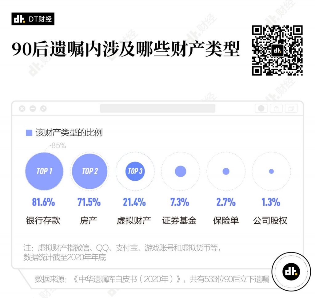 区别于其他年龄段的人群,有21.35%的90后把微信、QQ、游戏账号等虚拟财产写进自己的遗嘱中。