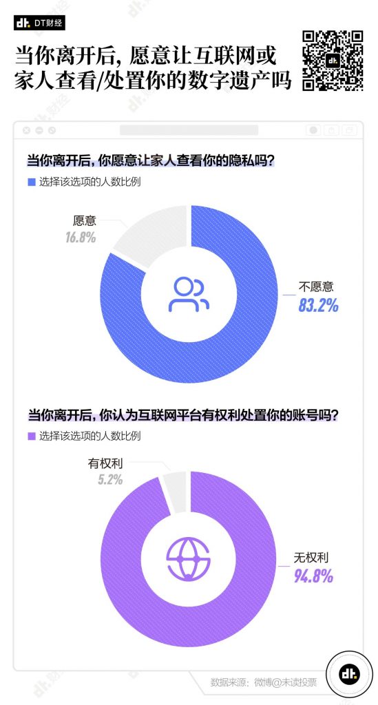 尽管人们在注册大部分APP时,勾选“我同意”的用户协议已经明确规定了用户对账号只具有使用权,所有数据记录最终归运营商所有。但在微博用户 @未读 去年就“网络遗产”话题发起的投票中,超过9成的人认为,互联网没有权利处置自己的账号;还有83.2%的人,并不希望家人查看自己的隐私。