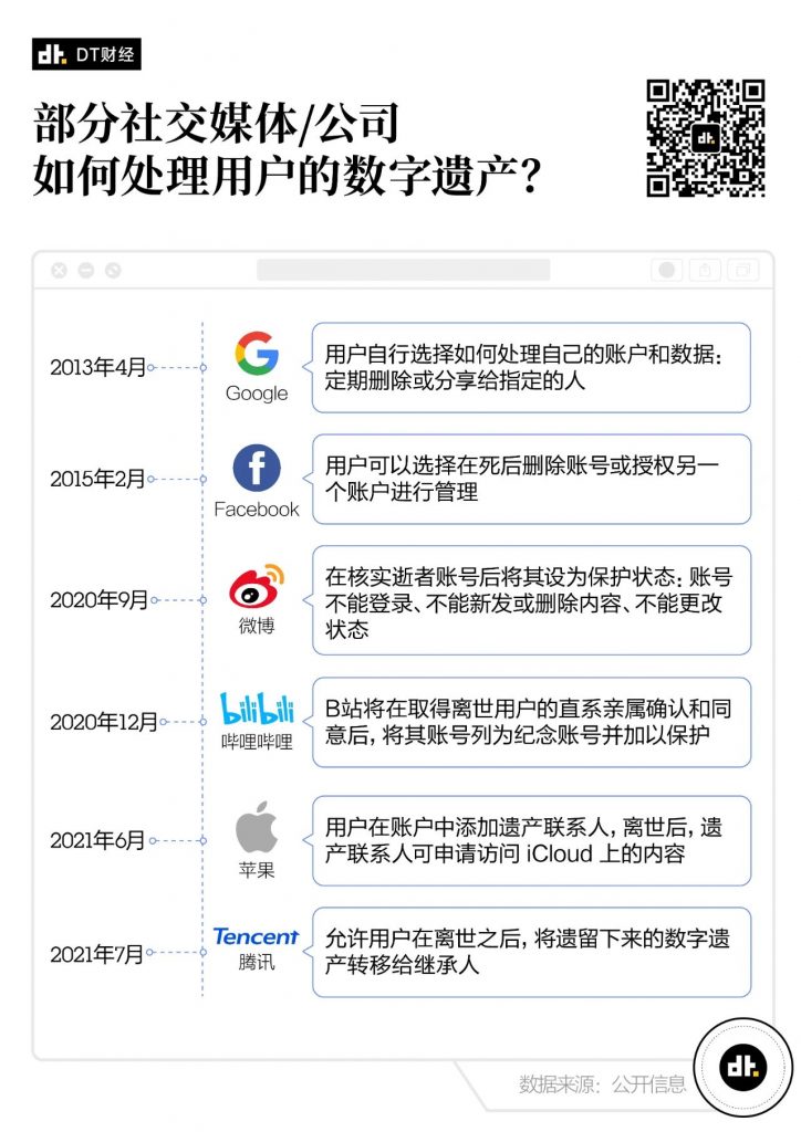 2021年6月,苹果在全球开发者大会上提出了数字遗产计划,7月,腾讯也公布了一项针对性的“数字遗产专利”。怎样处理用户的数字遗产,几乎成了所有平台必然会面临的问题。