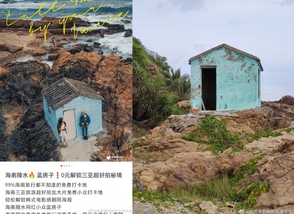 近日,一位微博网友发布了三张照片,前两张是小红书博主的种草图片,蓝色的小屋、嶙峋的石头,壮阔的大海,画面看起来小资又浪漫,标题写着是“海南陵水蓝房子,0元解锁三亚超好拍的秘境”。而第三张则是她实地探访的照片,所谓的“蓝房子”就像人们在路边就能看到的破旧小屋,虽然它的确是蓝色的。