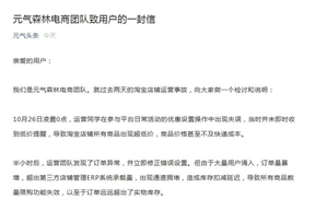 针对元气森林淘宝店铺运营事故,10月28日晚间,元气森林电商团队发布致用户公开信。