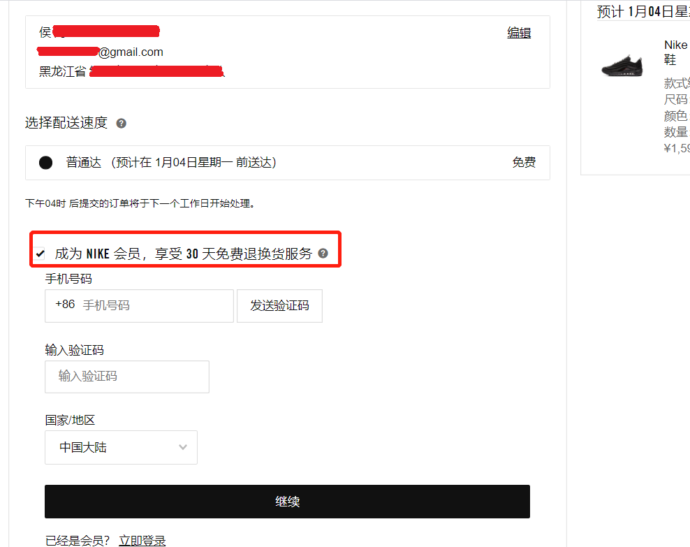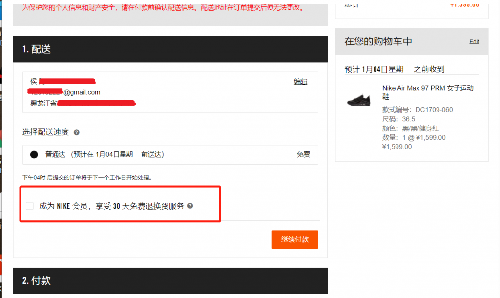 本以为到此为止,但在展开的付款页面,配送选项中出现了第四次入会提醒,诱饵是30天免费退换货服务。