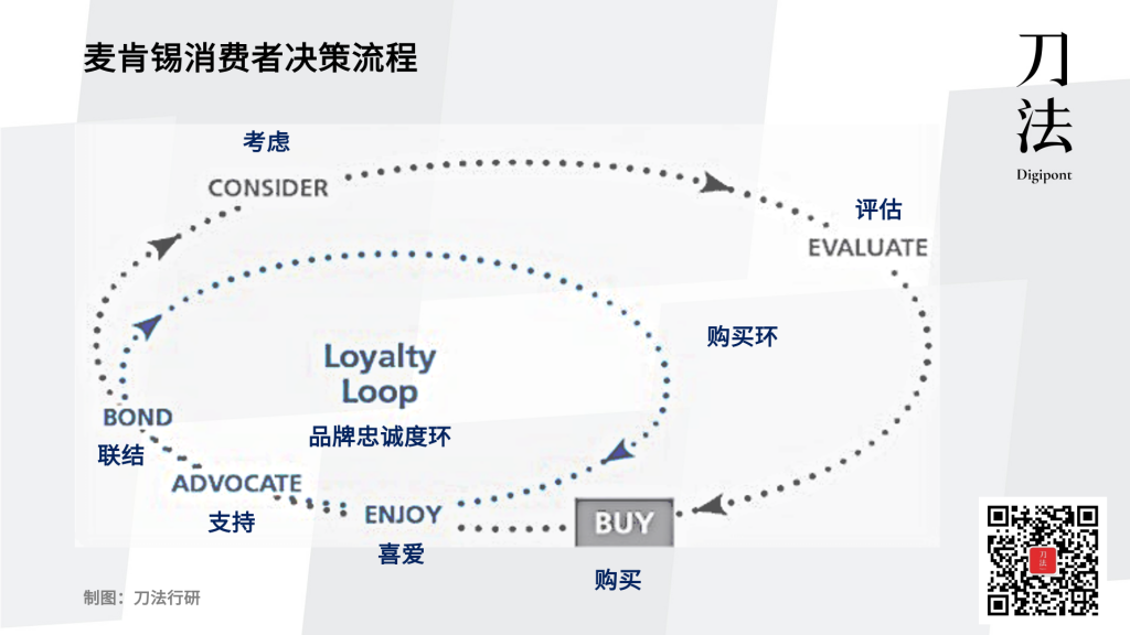 随着数字化营销兴起,麦肯锡认为现在的消费者已脱离传统的“漏斗式”选购方法,提出了消费者决策流程,认为现在是由消费者主导的营销时代。