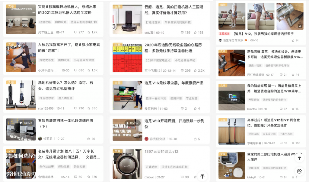 再以追觅的吸尘器为例,它是一个新锐国产品牌,以“智能清洁”这一精细化消费需求切入市场。最初市场认知度不高。什么值得买站内编辑通过对其吸尘器产品的功能、场景、价格、热点等多维度解读种草,用更贴近用户的方式转译品牌价值理念。