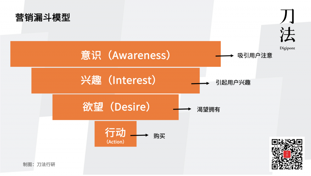 它将消费者在购买决策过程之中的变化分为四个阶段:意识、兴趣、欲望、行动。之前大部分品牌广告只是针对某单一阶段,其中又以吸引用户注意、引起兴趣为主。