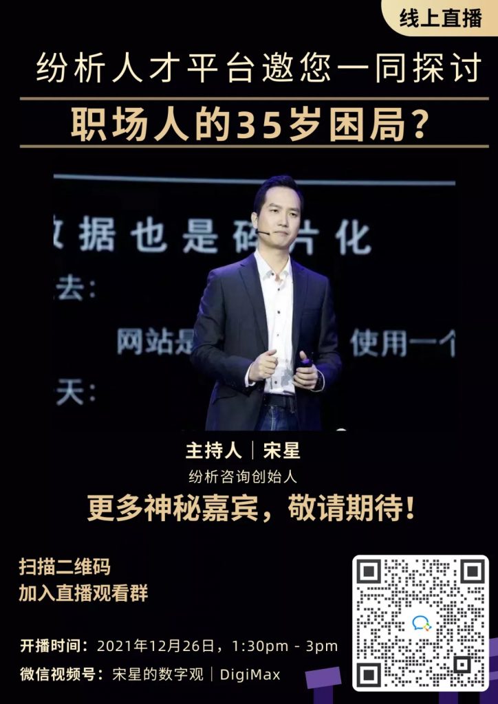 无论是在总有人正年轻着的快消领域,还是晋升之路相对和缓的B2B领域,或是充满狼性文化的互联网领域,35岁似乎都成了营销人的一道坎。因此,我们邀请了纷析咨询创始人宋星先生以及四位神秘嘉宾,以直播的方式,分享他们对营销人35岁困境的理解。
