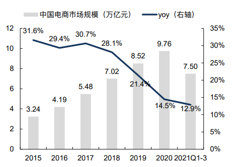 国内电商行业已经进入成熟期,市场规模增速呈现放缓态势。2018年及以前年增速尚在30%左右,但到了2020年网购人数达到7.82亿,排除部分偏远地区居民、老年人和婴幼儿人口后,电商行业用户规模触近网购目标客群规模的天花板,年增速不足15%。