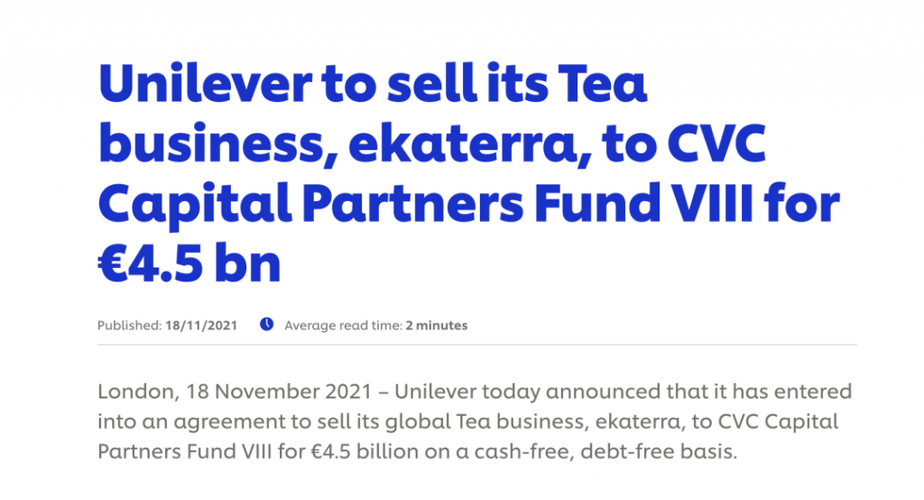 在刚过去的11月,有一则不起眼的消息:全球快速消费品巨头联合利华宣布,以45亿欧元的价格将其全球茶业务出售给一家私募基金。
