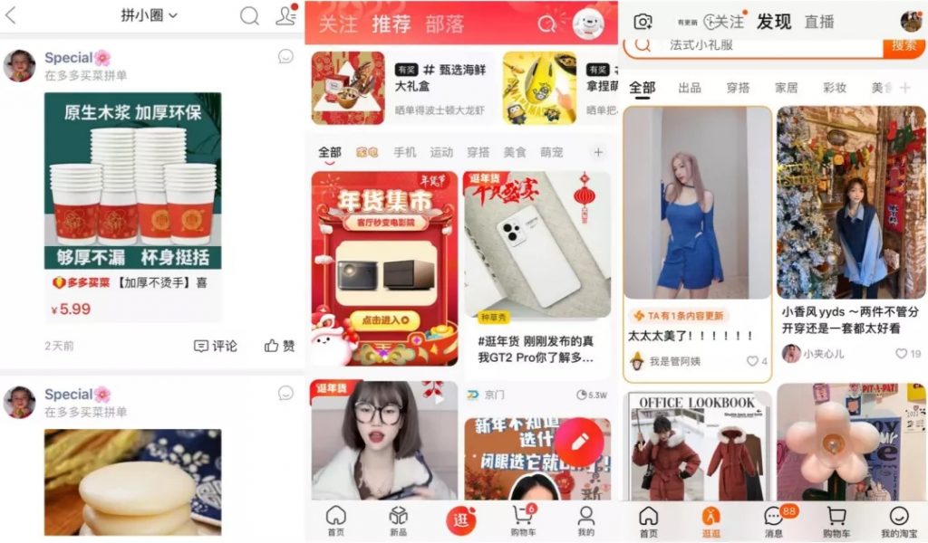 从左至右分别是:拼多多的拼小圈、京东的“逛”、淘宝的“逛逛” 来源 / 拼多多、京东、淘宝APP截图