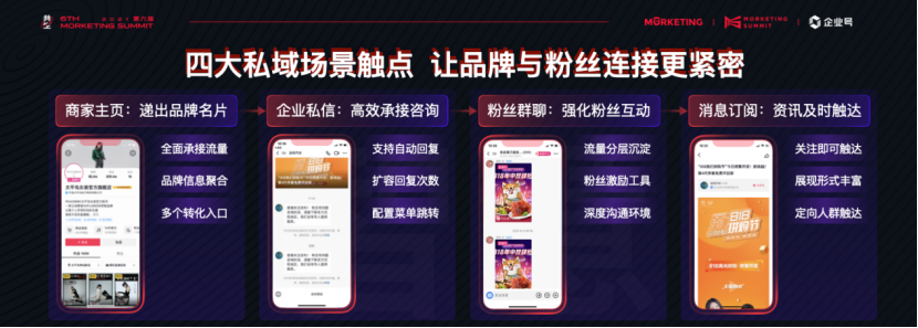 假设一个消费者在接触企业号内容之后,在商家主页上,可以一目了然看到完整的商家品牌信息,这是品牌信息的聚合页,有多个转化入口;在企业私信中,消费者可以与商家直接沟通留言,商家端支持自动回复、配置菜单跳转;还有粉丝群功能,消费者可以进群直接互动交流;而在订阅场景,商家可以定向人群信息触达。