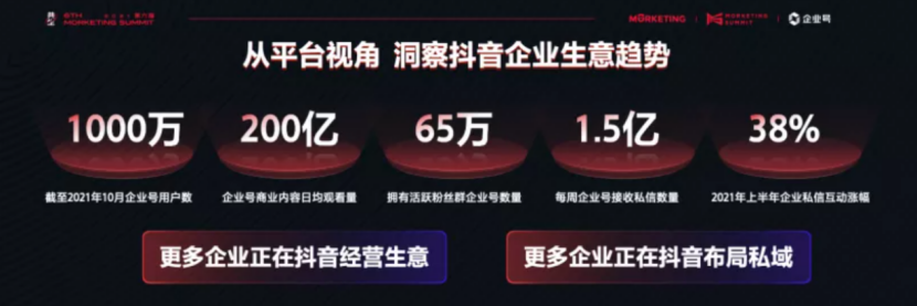 在Morketing Summit2021现场,巨量引擎官方透露出一组数据:截至到2021年10月,抖音企业号用户数量突破1000万;截至2021年上半年,企业号商业内容日均观看量高达200亿,企业号用户累计创建粉丝群数量超290万,累积粉丝互动量超过1.3亿次。