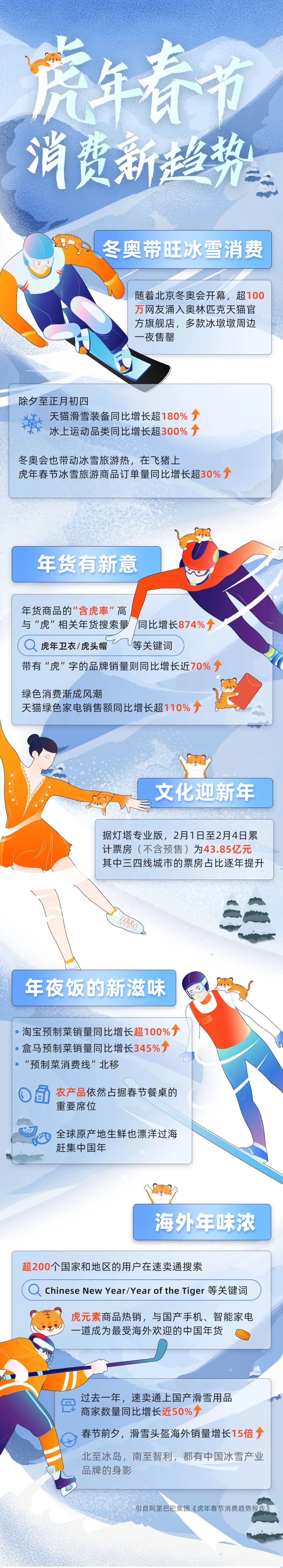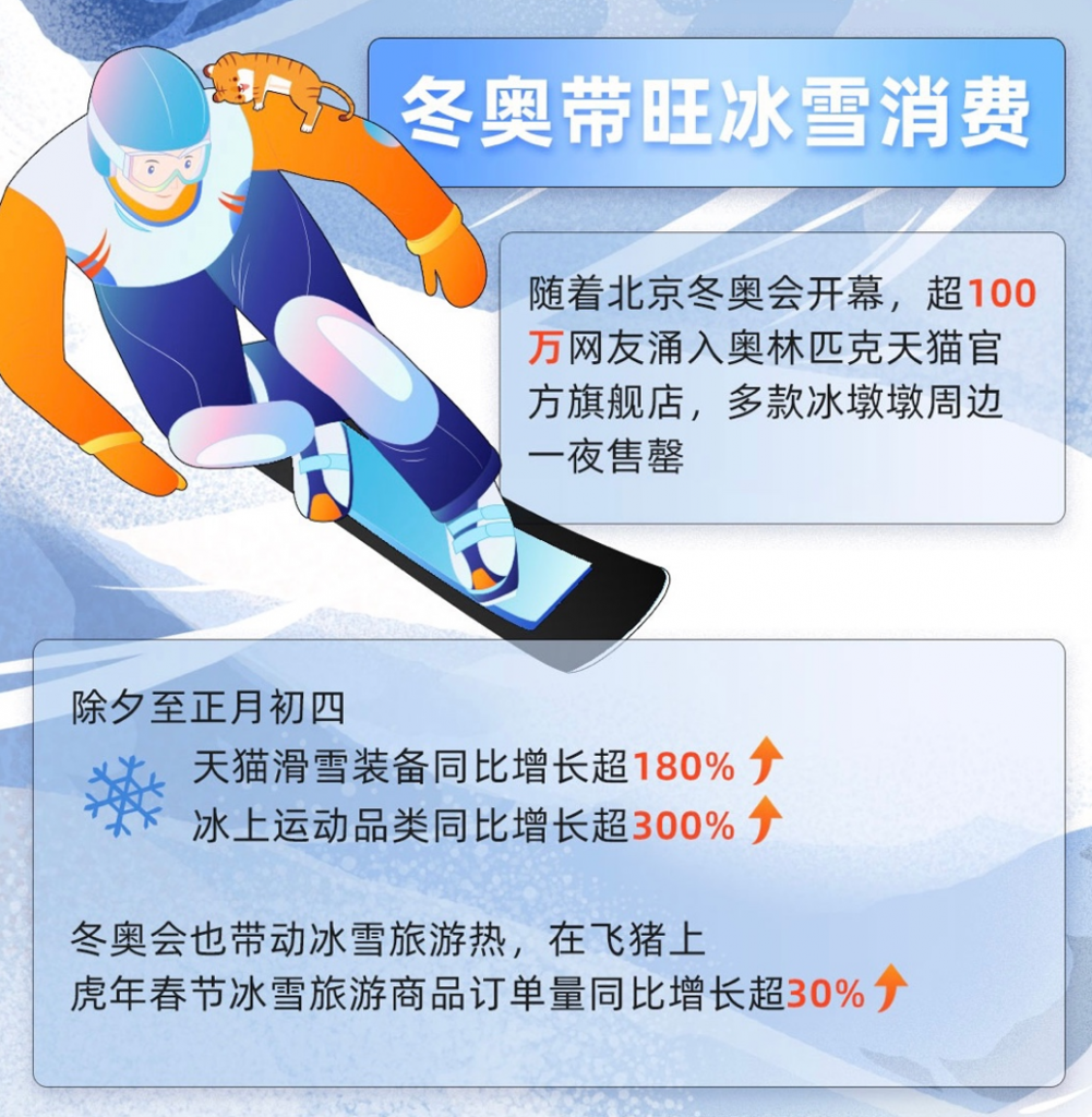 近日,阿里巴巴发布《虎年春节消费趋势报告》显示,春节遇上冬奥会,带旺了冰雪消费,也促进了冰雪产业发展,国内冰雪品牌迎来在海内外两个市场加速发展的新契机。