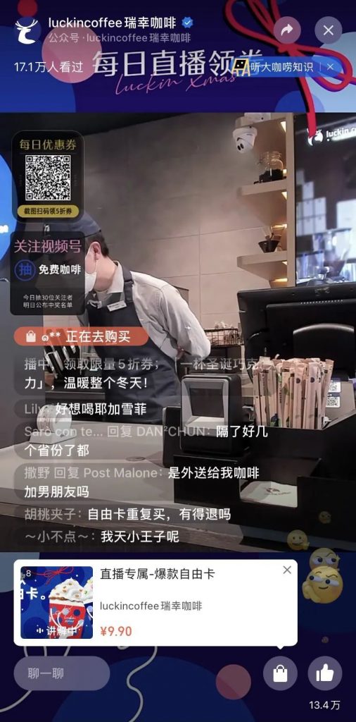 Morketing发现,瑞幸咖啡视频号直播间有17.1万人看过,13.4万个点赞。《2021智慧零售私域增长指南》显示,平均每天可达到15万用户观看。