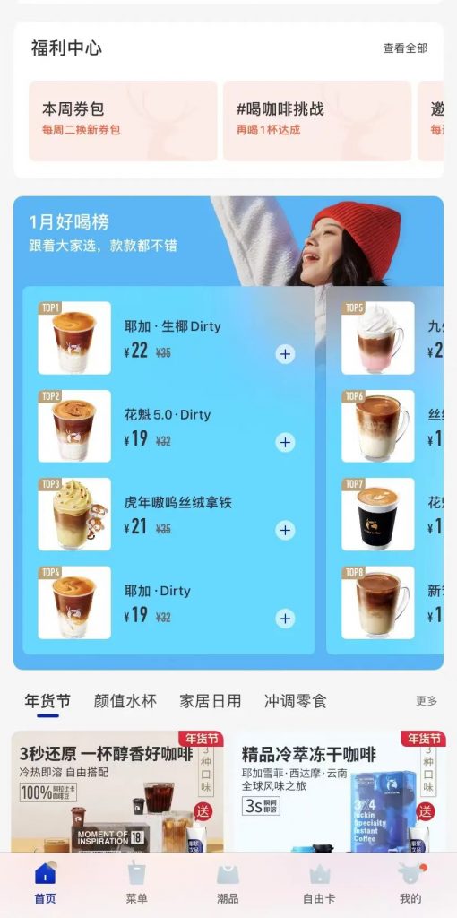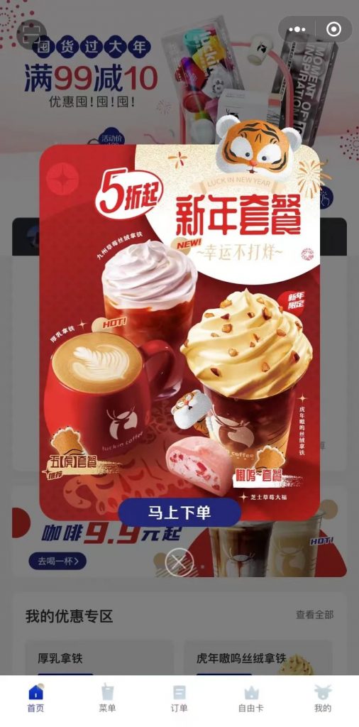 在小程序首页上方,瑞幸咖啡滚动推出多种活动、新品,比如针对新年推出的虎年嗷呜丝绒拿铁、当红芝士车厘子、满杯鸿运车厘子等新品,为喜欢尝试新品的消费者提供虎年新春应景产品,调动购买欲。
