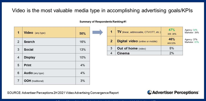 电视最有价值。视频在实现广告目标方面超越了所有其他媒介,电视再次在视频中领先。具体来说,现在有 47% 的广告主将所有形式的电视都排在首位,高于一年前的36%。相比之下,46%的受访者将数字视频放在首位,低于一年前的53%。