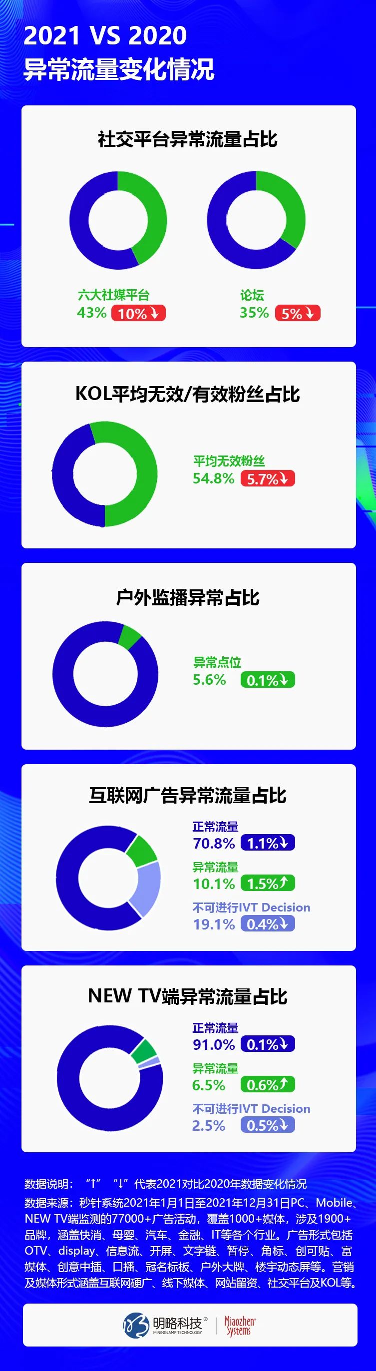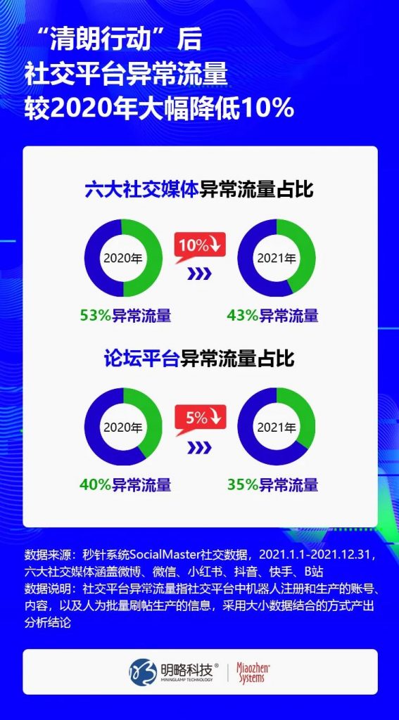 《2021中国异常流量报告》显示:社交媒体异常流量占比43%,较2020年大幅下降10%;论坛类平台异常流量占比为35%,较2020年下降了5%。
