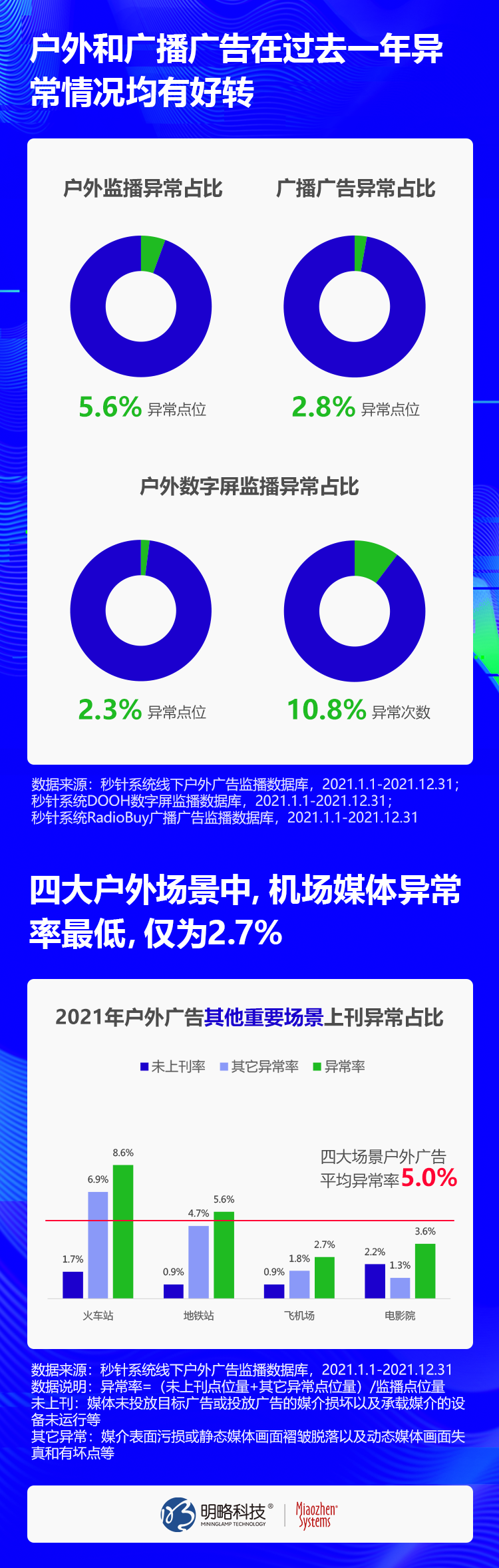 · 户外监播异常占比5.6%,广播广告异常占比2.8%,数字监播中异常点位占比2.3%,异常次数占比10.8%。