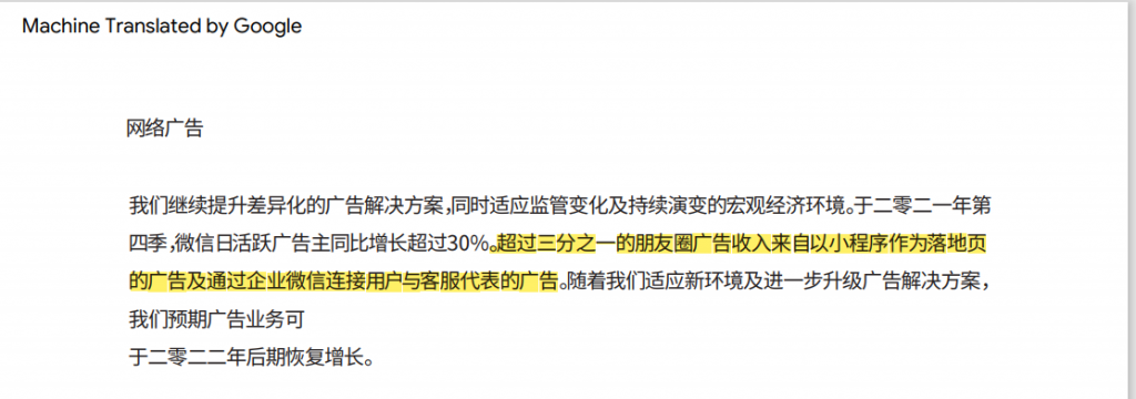 财报显示,超过三分之一的朋友圈广告收入来自私域,包含小程序作为落地页的广告以及通过企业微信连接用户与客服代表的广告收入。