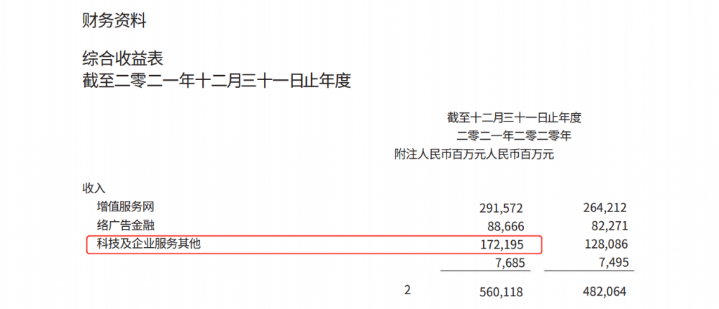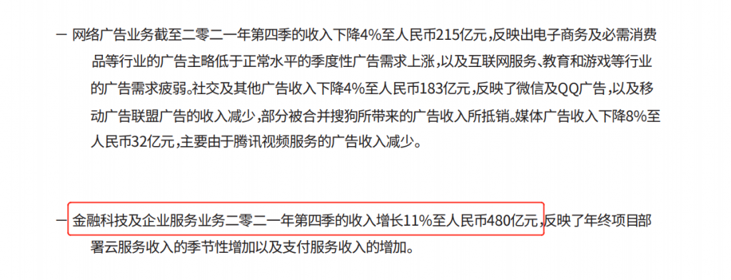 2)在财报中,腾讯To B业务首次超过网络游戏,成为公司第一大收入来源:“金融科技及企业服务业务截至二零二一年十二月三十一日止年度的收入同比增长34%至人民币1722亿元。”其中,第四季度收入增长11%至480亿元。