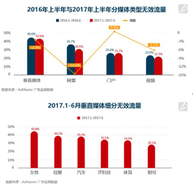 分媒体类型:垂直媒体无效流量占比持续相对最高,网盟紧随其后。同比2016年上半年,门户无效流量占比有小幅上升。在细分垂直媒体中,女性、母婴、汽车无效流量占比较高,持续2016年全年细分垂直媒体无效流量前三名现状。