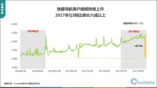 在地图导航领域,整体用户规模2017年Q3较2016年Q3增长了六成以上。