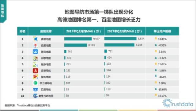 以月均MAU计算,地图导航市场第一梯队出现分化局面,高德地图以9967万的月均MAU排名第一,较上季度的增长率为12.83%,而排在第二位的百度地图月均MAU为8193万,相比上季度,用户规模下降了-0.55%。