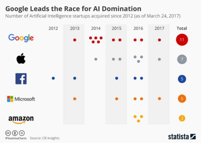 CBInsights有统计数据显示,收购AI公司的竞赛已经开始/ 2018年将是当公司竞争智力资本和人才时产生越来越多的兼并和收购的一年。机器学习/ AI空间中的所有较小的玩家将被大型公司收购。有两个原因: