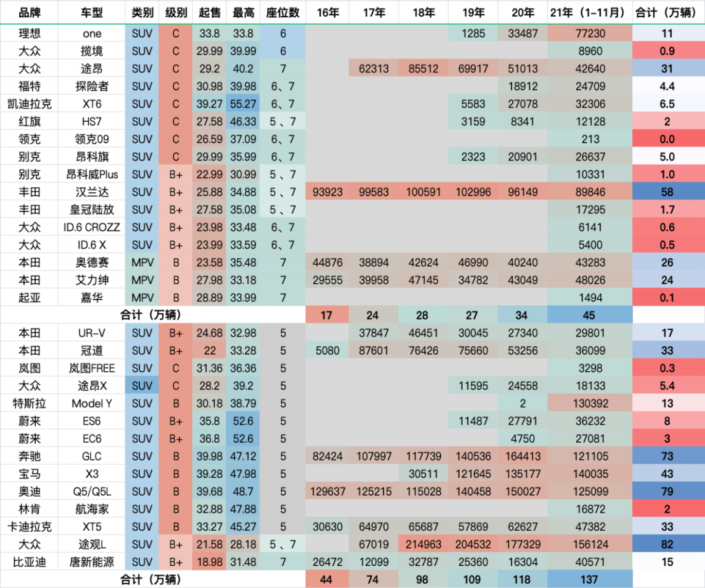 在中国汽车市场上,如果按照有6-7座、价格在25-40万之间设置条件,来选择主要的家用SUV、MPV车型(排除商务车型如GL8、排除越野SUV如撼路者),包含理想ONE在内共有16个车型。如果更进一步,把5座车型也纳入考虑范围,包含理想ONE在内共有30个车型。这个市场无论是车型投放还是销量都处于快速增长阶段。