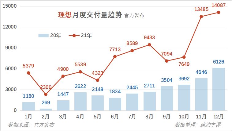 2021年12月,理想ONE的月度交付量再创新高,达到14087辆。至此,理想ONE连续两个月实现销量破万,继续保持中国造车新势力单车型销量第一。