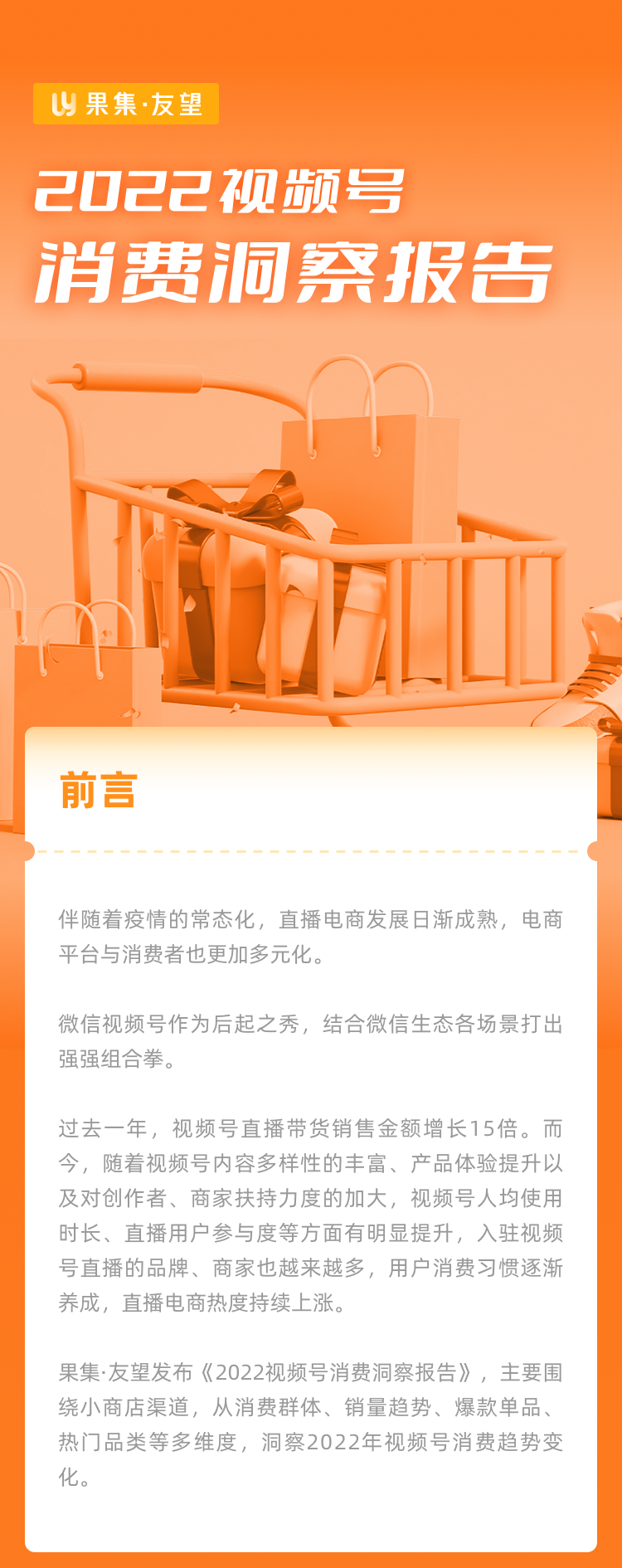 《2022视频号消费洞察报告》主要围绕小商店渠道,从消费群体、销量趋势、爆款单品、热门品类等多维度,洞察2022年视频号消费趋势变化。