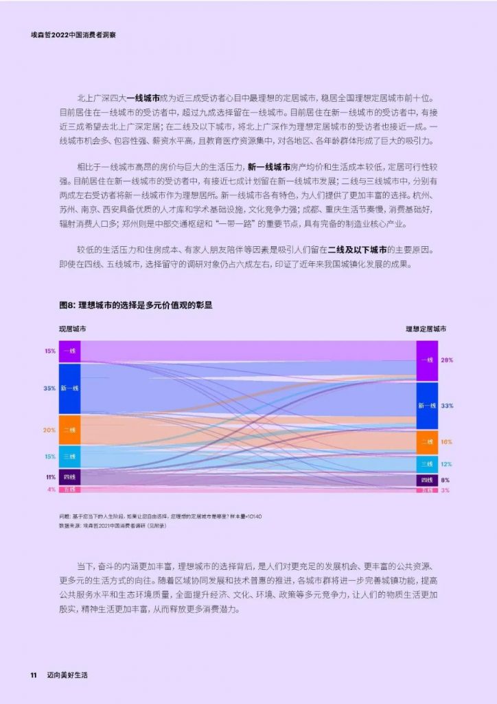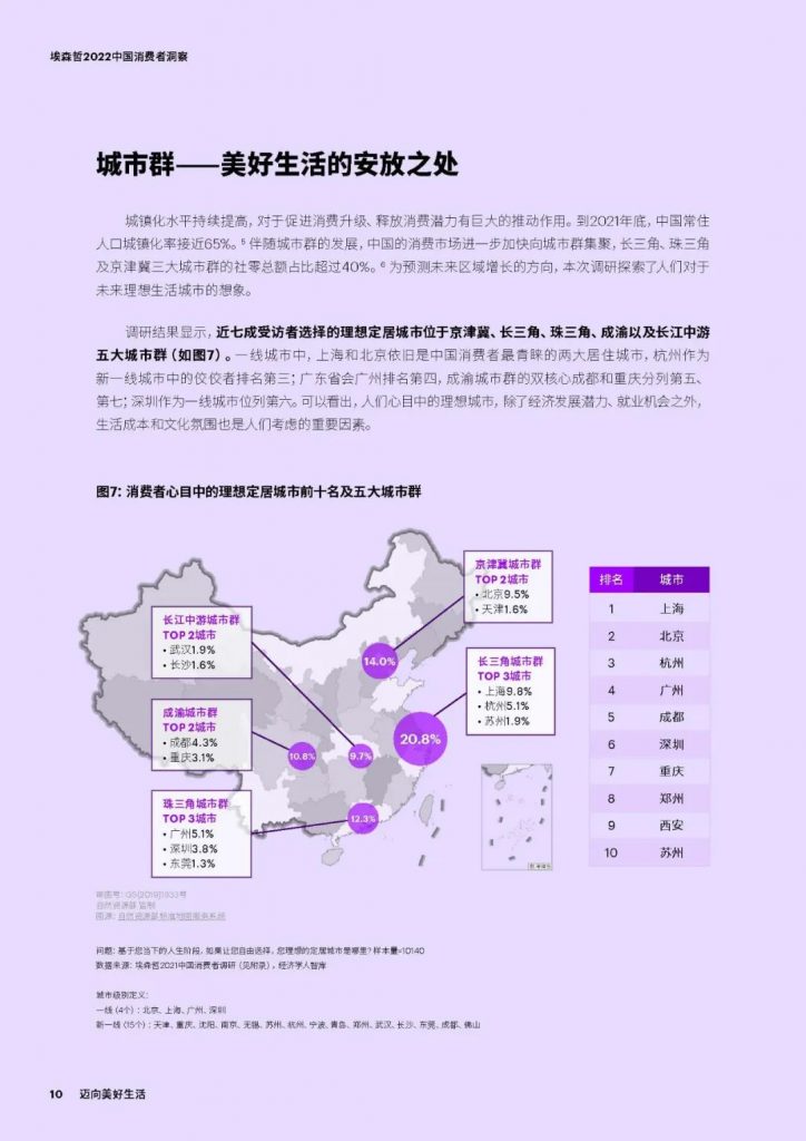 三线及以下小镇生活依然惬意,消费意愿高于一二线城市,而储蓄意愿相对更低。随着城镇化的进一步提升,越来越多人的理想定居城市开始往五大城市群(京津冀、长三角、珠三角、成渝以及长江中游城市群)靠近。上海依然是理想定居城市的榜首位置(不知道经历这几个月的波动之后结果是否会有变化?)。新一线依然是最多人最终的理想去处,没有一线那么大的生活压力,也不失优质的生活品质。