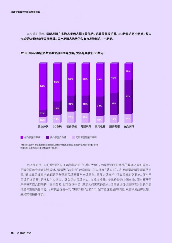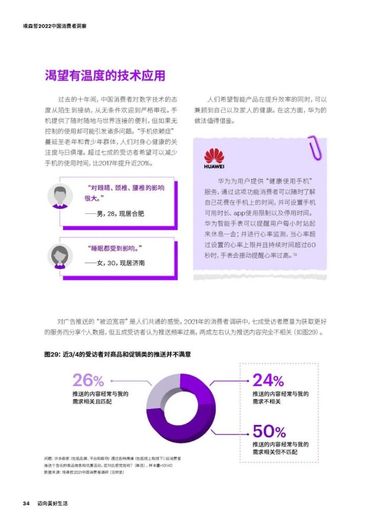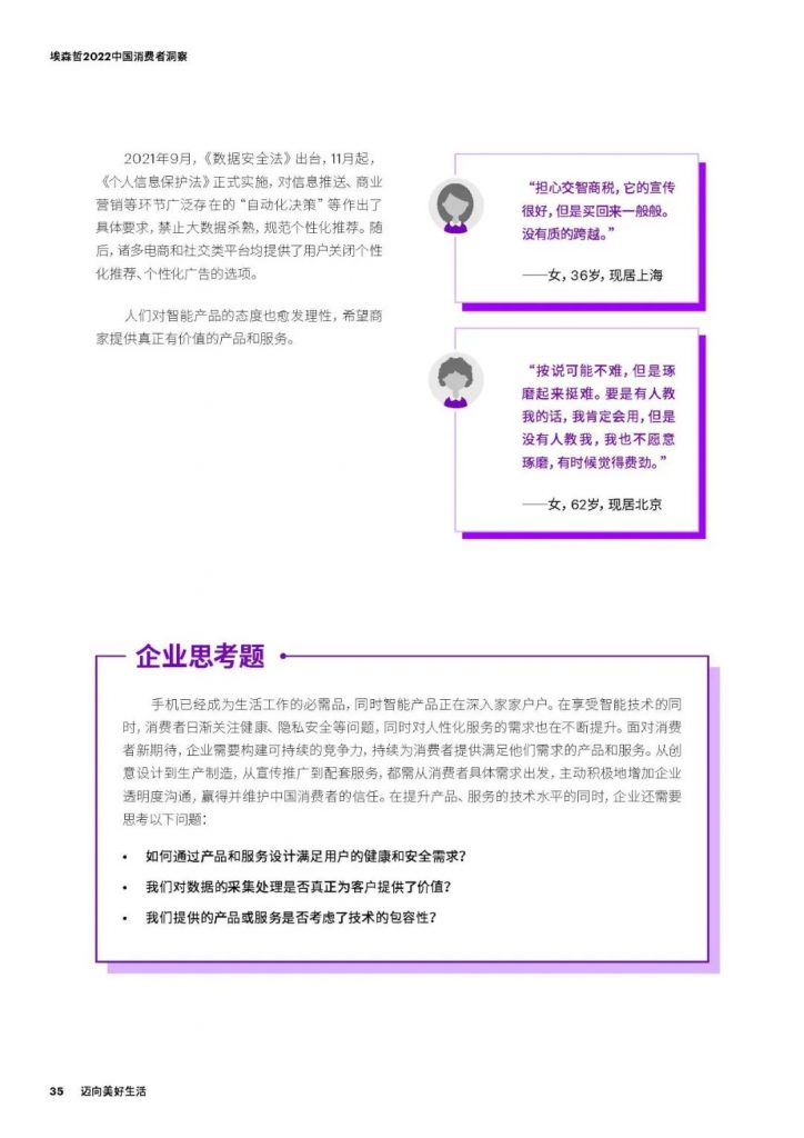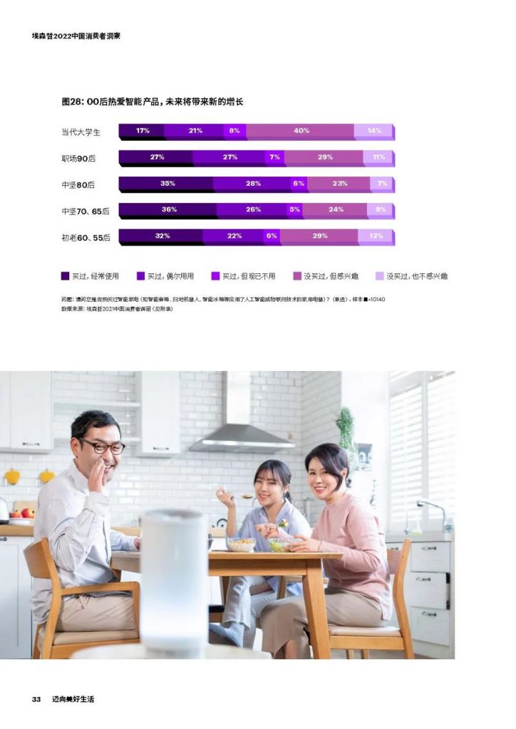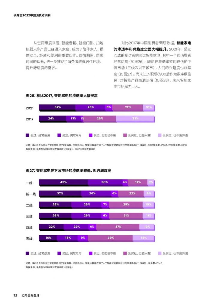 最后关于技术的创新对消费市场的影响。随着近两年缺“芯”潮的大幅蔓延可以看出,整个社会对于数字化和智能化的趋势不可阻挡。对比2017年,我们从报告中也可以看到消费者对于智能化产品接受程度和渗透率的大幅度提升。智能家电在一线和新一线城市远高于其他城市。虽然从技术层面来说,消费电子产品本身的技术含量和产品质量要求远低于大多数工业和汽车相关产品技术要求,但消费者更渴望的确是“有温度”的技术。